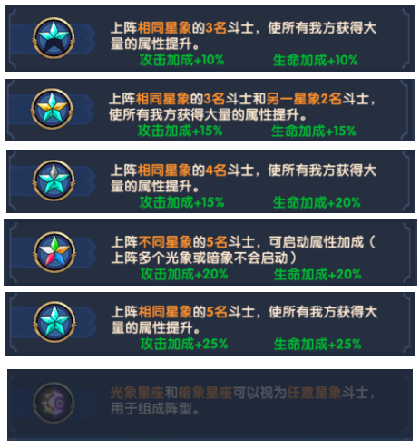 4.上阵不同星象的5名斗士,可启动属性加成(上阵多个光象或暗象不会启动)。
